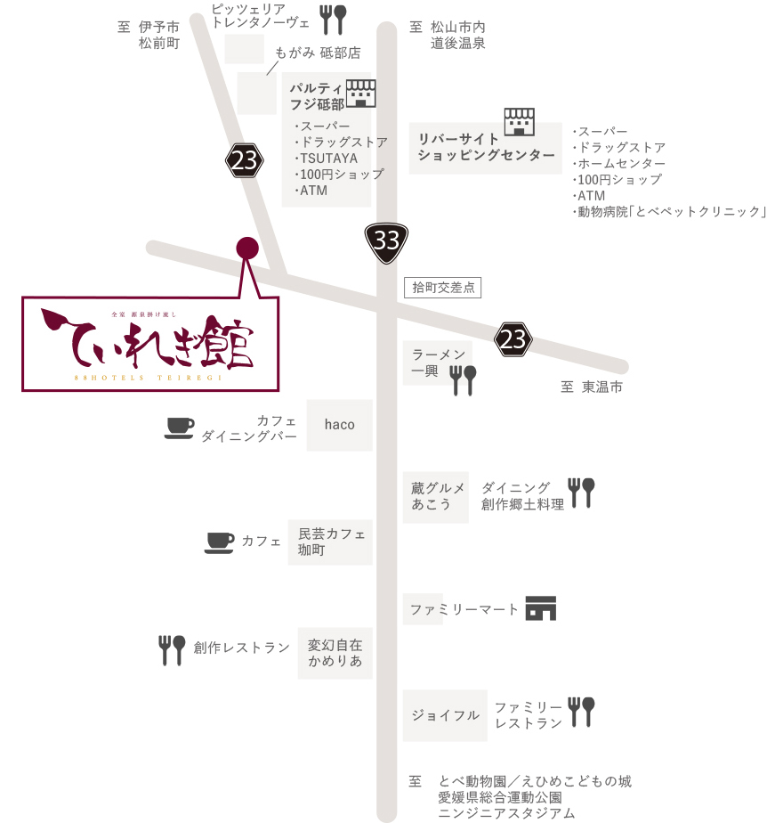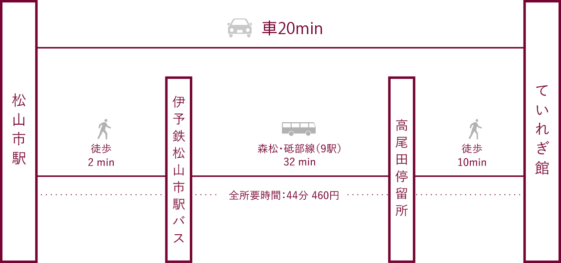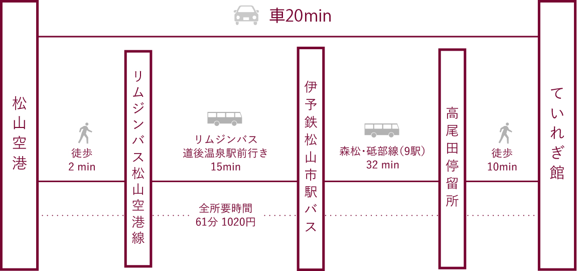 松山インターから車で5分 / 松山市内まで車で20分 / 松山空港まで車で20分。
